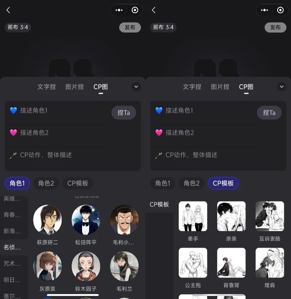“AI角色创作平台”捏Ta可能也面临类似窘境。简单来说,它提供的是同人漫的一键生成,玩法包括“文字捏”、“图片捏”与“CP捏”。前两种就是输入文字或上传形象生成漫画,“CP捏”则是选定角色与姿势让他们来个亲密合影。