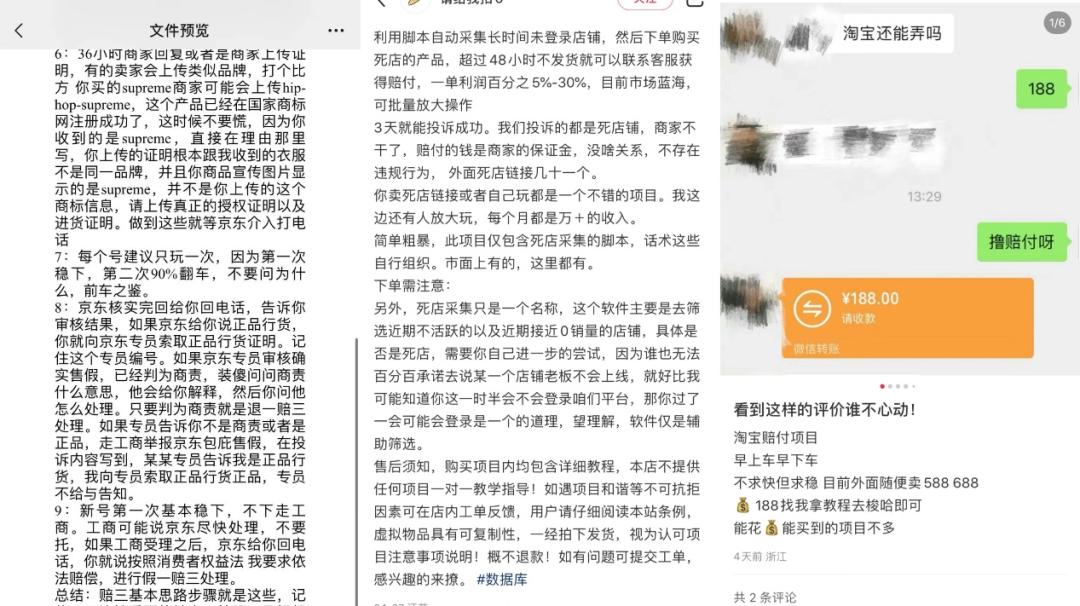 锌刻度在各大社交媒体搜索发现,这些项目大多被称为“赔付项目”,针对拼多多、京东和淘宝等各大电商平台。这些项目主要通过社群进行,进群后根据教程操作,下单后延迟发货或者有漏洞的商品,或是质疑商家售假,从而退货并联系客服赚赔付,前者赔付一般一单100元,质疑售假则可能“假一赔三”。而普通人一般有两种“上车”方式,一是支付38.8元-188元不等的教程费,另一种则是免费“上车”,但每单收益需向群管理员交提成,比例为30%-50%不等。