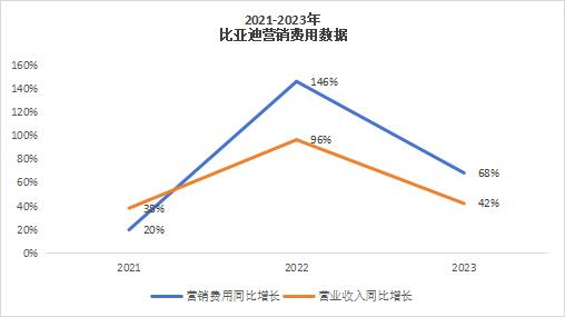 以2022年宣布停产燃油车为节点,2021-2023年,比亚迪营销费用占比营收的比例分别为2.82%、3.54%以及4.18%,有逐步上升的趋势;在这种情况下,从2022年开始,比亚迪营销费用的同比增速就超过了营收的同比增速。