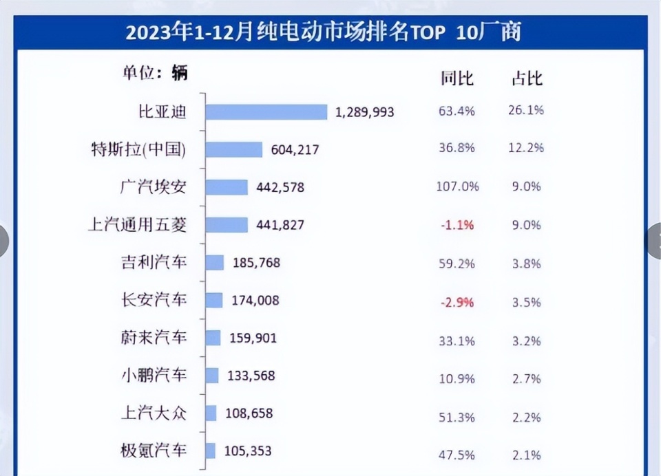 从乘联会公布的数据中,可以看出2023年纯电市场排名中比亚迪位居第一,占比总市场份额的26.1%,而广汽埃安和上汽通用五菱分别排名第三和第四,位于特斯拉之下,占比均为9%。另外,排名第六的长安汽车,其知名度较高的纯电车型长安Lumin售价也在10万元以下。