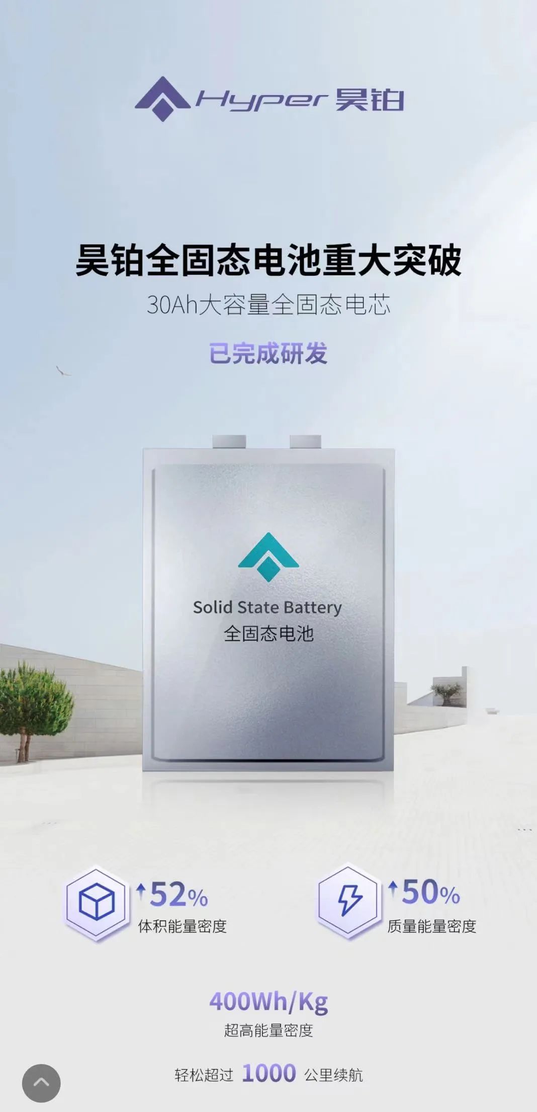 值得一提的是,同样在今年4月加码固态电池的还有广汽埃安旗下昊铂品牌。4月12日,昊铂官博发文表示:全球首个30AH大容量全固态电芯,100%固态电解质电池已经研发完成,可以轻松实现超1000公里续航,并计划在2026年装车搭载。
