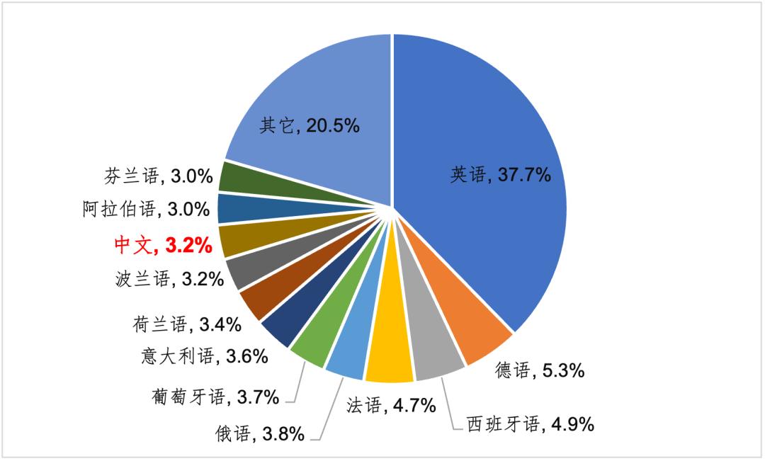二是数据集。我国数据规模大。根据国家互联网信息办公室《数字中国发展报告(2022年)》,2022年我国数据产量8.1ZB,全球占比10.5%,位居世界第二。这被看作发展相关产业的优势。然而,规模优势不足以弥补质量欠缺。不管把多大数量的马车连续相加,也决不能得到一条铁路(熊彼特,1934)。数据质量至少同等重要。在Hugging Face的高质量数据集中,英语以37.7%的比重位居第一位,中文仅占3.2%,和波兰语并列第九(来源:OECD,2023)。如下图所示。我国数据集的质量仍有待进一步提升。当然,这非一日之功,需要历经岁月的积累。