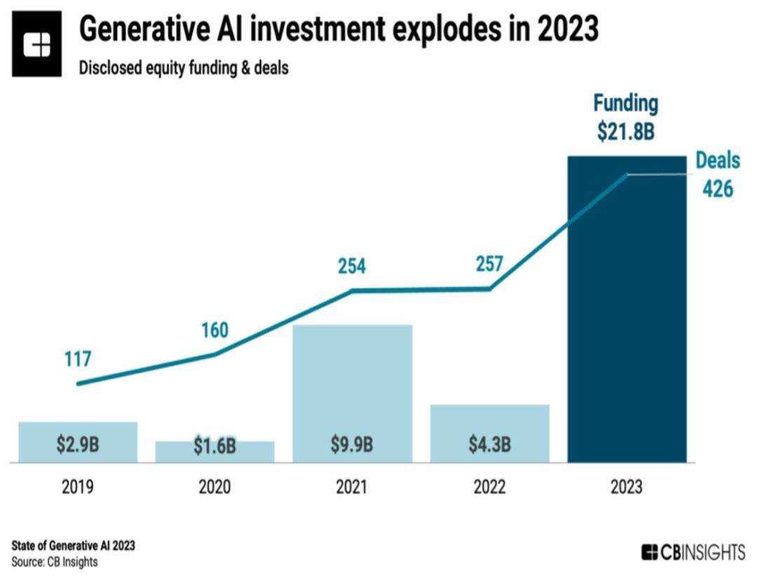 近年是全球风险投资的低潮,生成式AI(GenAI)却逆市而起,去年的融资笔数和融资额分别增长66%和400%(来源:CB Insight,如下图所示),融资额高居所有细分领域第一位(来源:Dealroom.co)。去年美国前5大风险投资中,OpenAI、Anthropic(2笔)和Inflection AI三家GenAI公司占据了4个,融资额分别高达100亿美元、40亿美元、20亿美元和13亿美元,主要投资者是微软、亚马逊、谷歌和英伟达等巨头(来源:Crunchbase)。