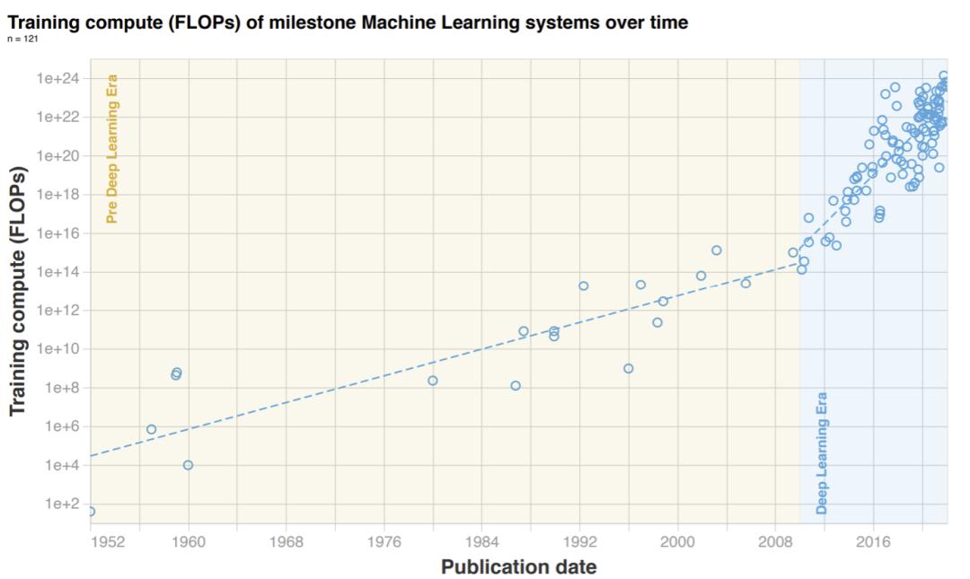里程碑机器学习系统的训练算力需求,来源:Sevilla J, Heim L, Ho A, et al. Compute trends across three eras of machine learning. 2022.