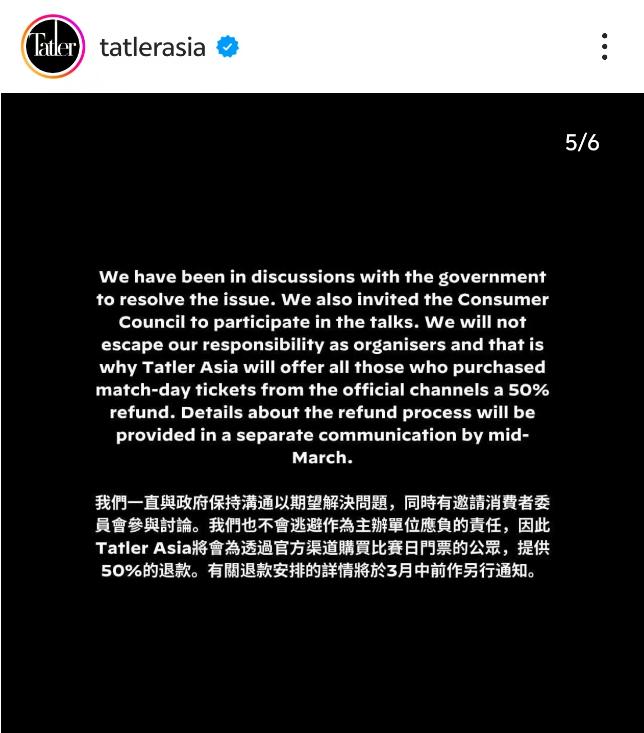 至于邀请迈阿密国际来港的主办方Tatler Asia则没有那么幸运了。在风波发生后,主办方Tatler Asia只是简单地开新闻发布会“敷衍了事”,表示对此事感到遗憾和主动撤回资金补助申请。最后在香港特区政府的施压之下,Tatler Asia才表示可以退门票价格的50%。