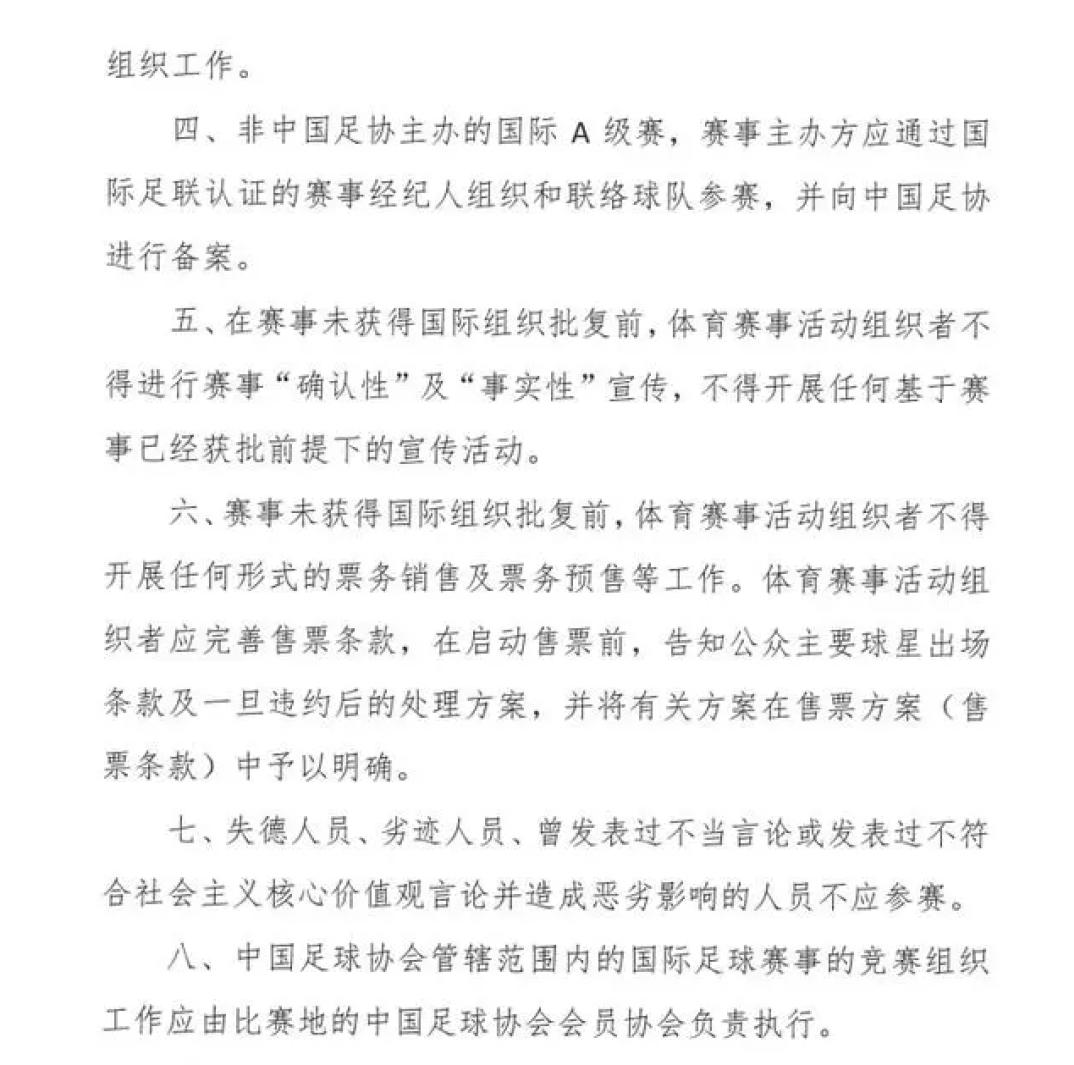 所以此次中国足协修订的内容正是为了堵上此前存在的“漏洞”,避免这类事件再次发生,维护购票球迷的利益。其中有两点最受外界关注。一是“在赛事未获得国际组织批复前,体育赛事活动组织者不得进行赛事确认性及事实性宣传,不得开展任何基于赛事已经获批前提下的宣传活动,不得开展任何形式的票务销售及票务预售等工作。”