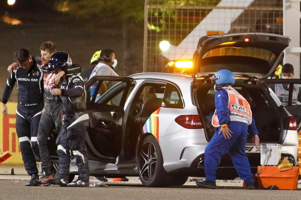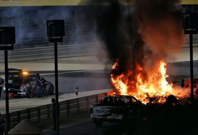 2020赛季巴林站,车手格罗斯让的赛车受到撞击,电池组遭受撞击后引燃了油箱导致爆炸并引发大火。