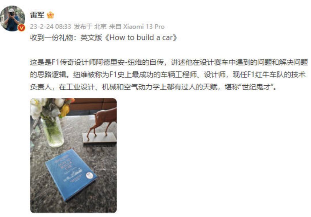 这也能理解为什么雷军在宣布造车后,晒出的第一本和汽车相关的书籍,就是红牛车队首席设计师纽维的著作《How to Build a Car》。