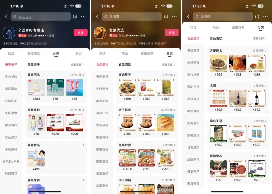 通过对比老葛优选和辛巴818专属店,「庄帅零售电商频道」发现老葛优选的商品分类做得比辛巴818专属店更为细致,商品数量也更为丰富。