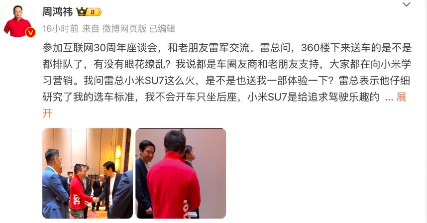 4 月 20 日晚间,360 公司创始人周鸿祎在社交平台表示,日前在与小米集团董事长雷军会面时曾发问,小米 SU7 这么火,是不是也送自己一部体验一下。