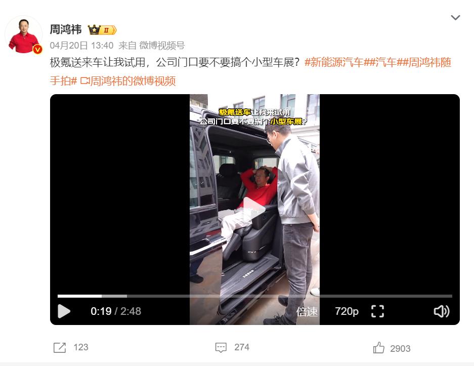 刚刚老狐说到,周鸿祎在《红衣卖车征集令》微博视频里,cue 到了国内的新能源车企,意思是,谁有意向送台车来,他可以做个 “ 体验官 ” 。