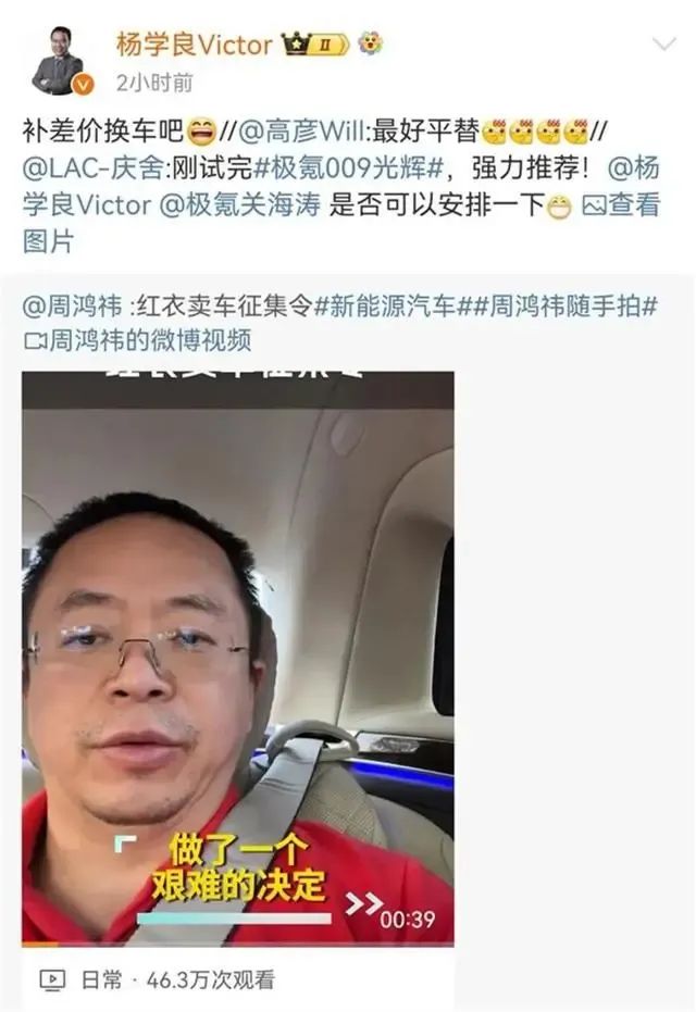 浙江吉利控股集团高级副总裁杨学良转发称 “ 补差价换车吧 ” ,力荐极氪 009 光辉。