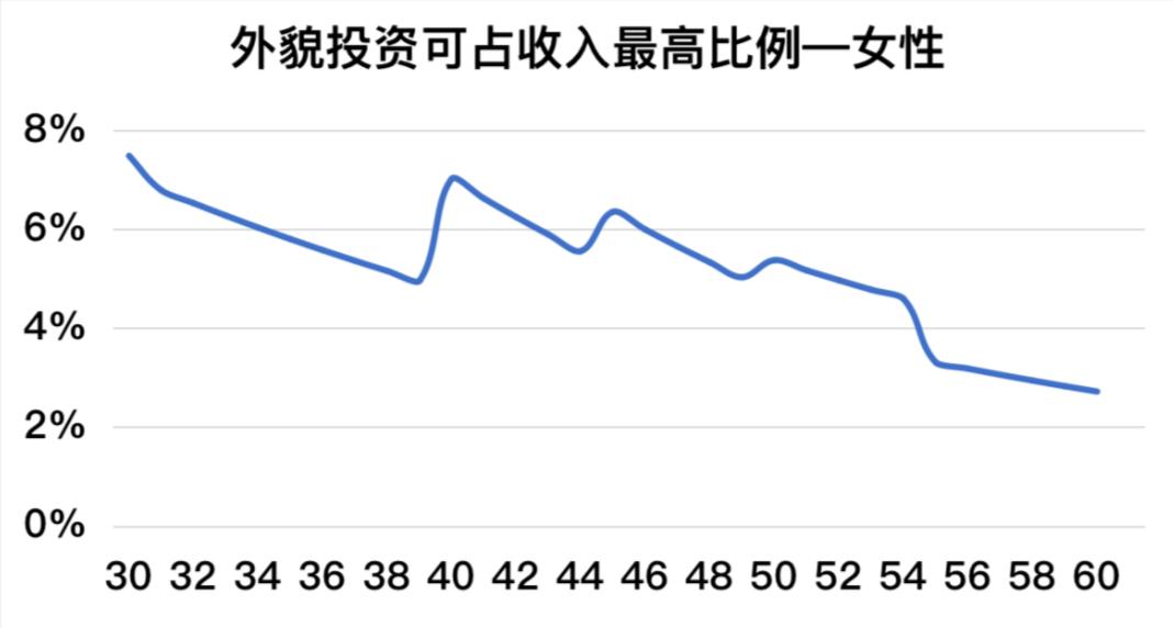结果发现,如果只考虑美貌溢价带来的收入增长,在维持总体投资收益平衡的前提下,投资初期(30岁时)普通男性和女性最多只能拿出工资的15%和8%进行外貌投资。其他各个年龄阶段的具体比例如下: