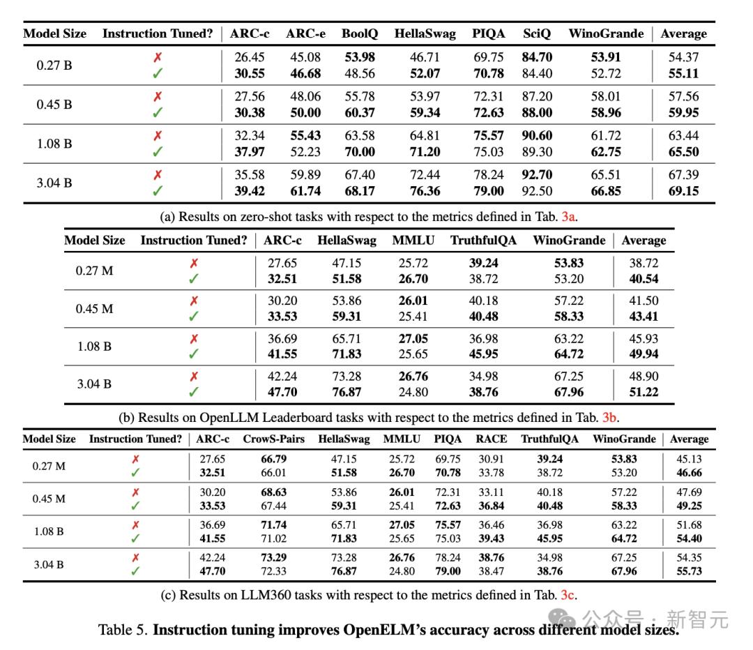 如下表5所示,在不同的评估框架中,指令微调都能将OpenELM的平均准确率提高1-2%。