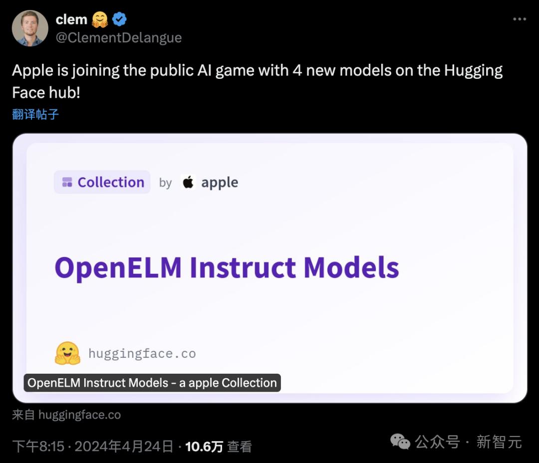 抱抱脸创始人表示,苹果加入了AI开源大战,一口气在HF中心发布了四款模型。