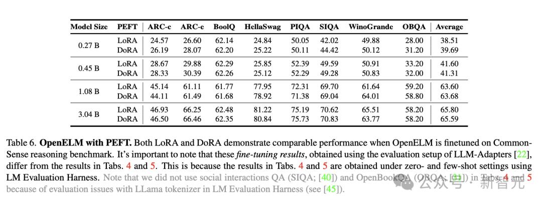 表6展示了参数高效微调的结果。PEFT方法可以应用于OpenELM,LoRA和DoRA在给定的CommonSense推理数据集中,提供了相似的平均准确度。