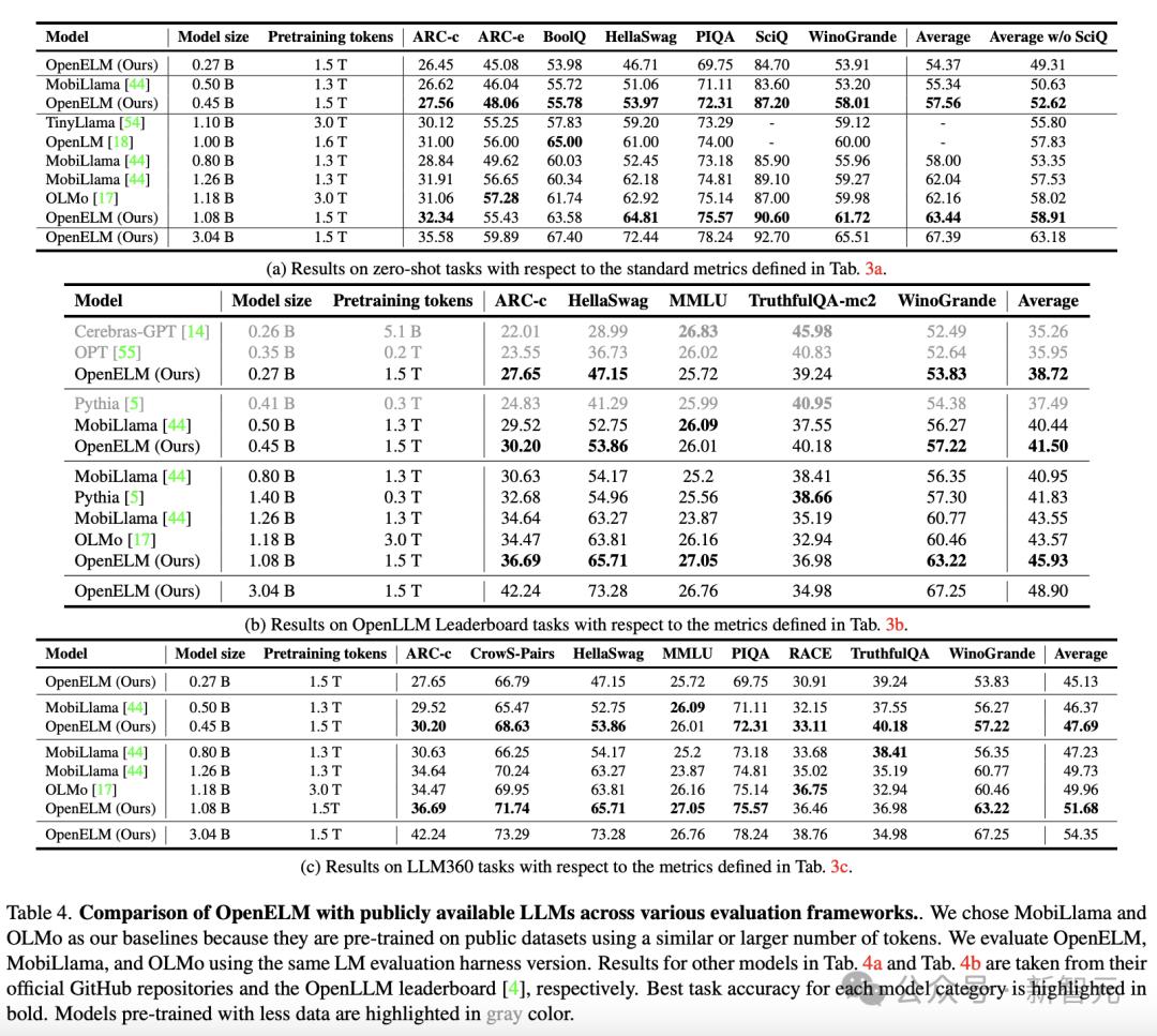 通过与开源的大模型比较,OpenELM的变体比12亿参数OLMo的准确率提高了1.28%(表4a)、2.36%(表4b)和 1.72%(表4c)。