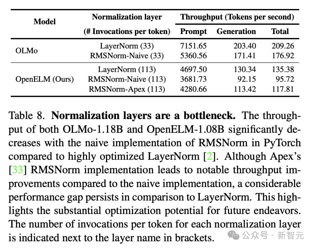 分析结果表明,OpenELM处理时间的很大一部分,归因于研究者对RMSNorm的简单实现。