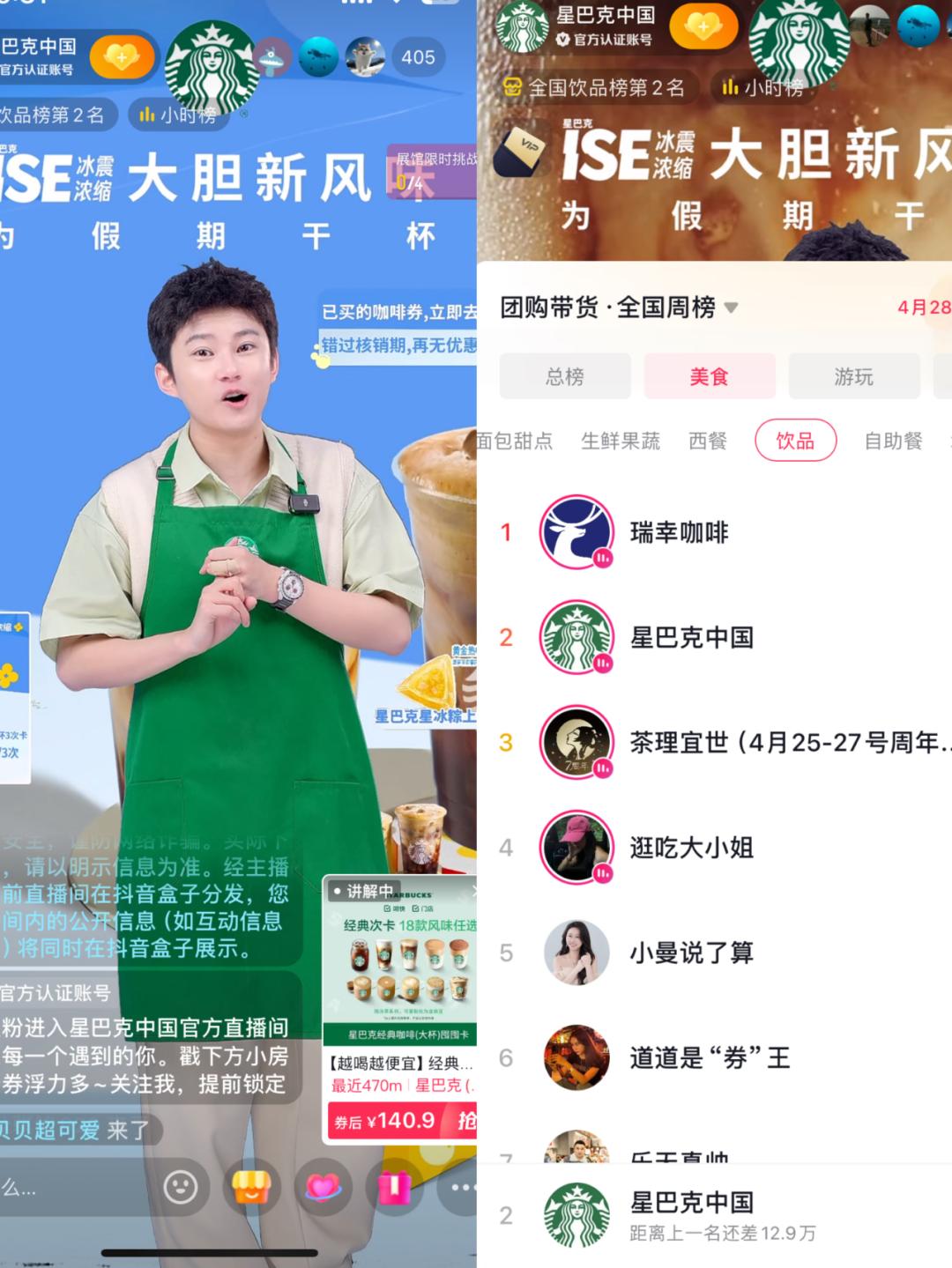 「财经无忌」观察“星巴克中国”抖音直播间发现,趁着抖音本地生活的东风,星巴克中国吃到了团购的红利,据“抖音团购全国周榜”显示,在今年4月前三周,星巴克中国的排名分别为25/39/77位。