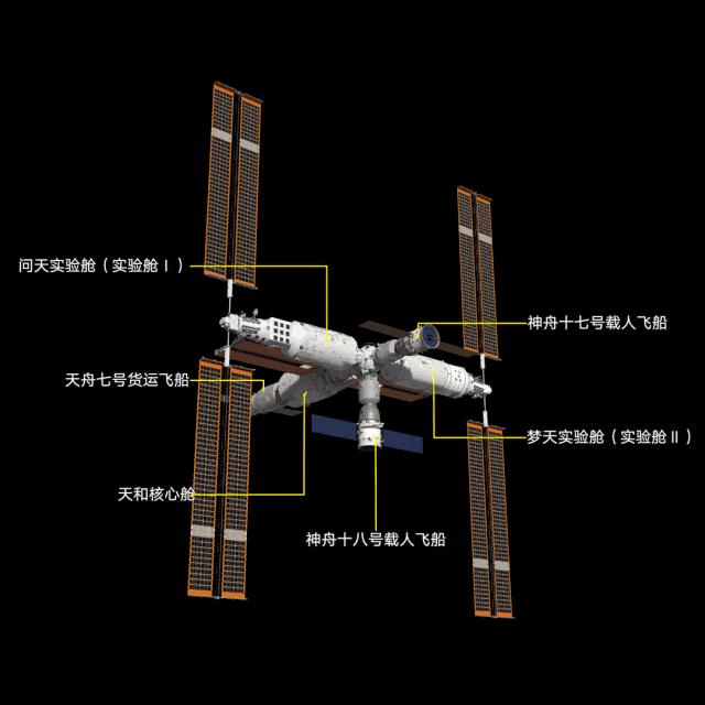 中国的“天宫”再度形成由天和、问天、梦天和天舟七号、神舟十七、十八号构成的“三舱三船”百吨级组合体!
