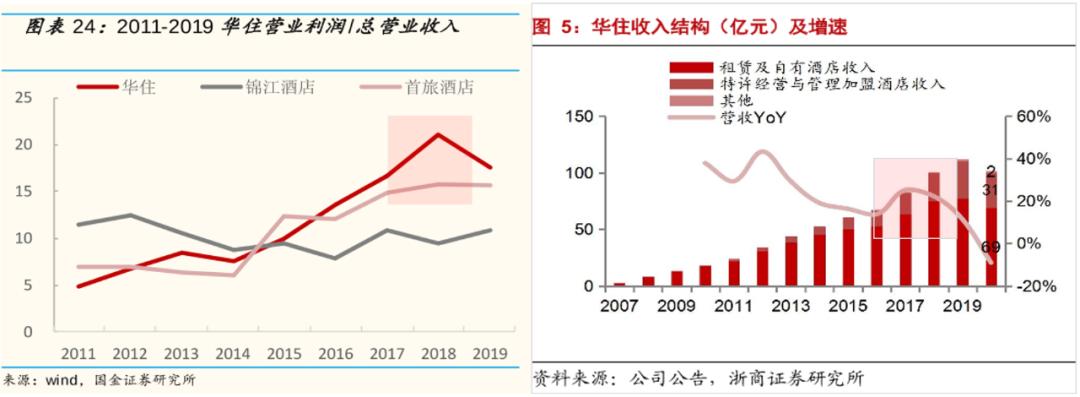 比如,2018年行业入住率下滑后,华住、首旅就靠着挺价,经营利润率双双达到顶峰。