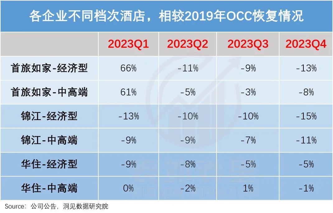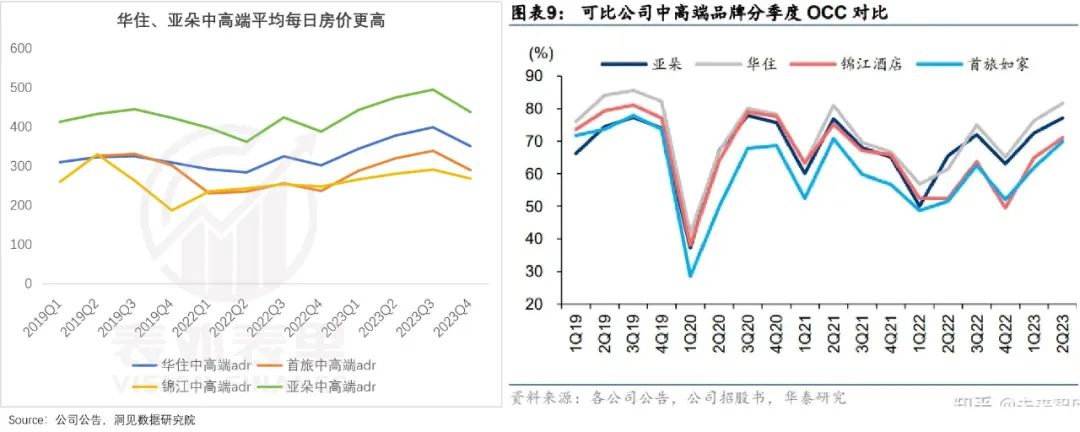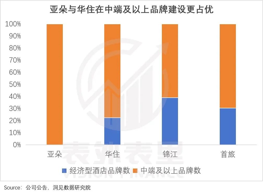 而业绩的分化,就来源于高端品牌建设的差距:截至2023年末,华住、亚朵的中高端品牌数占比都在75%以上,高出锦江、如家一截。