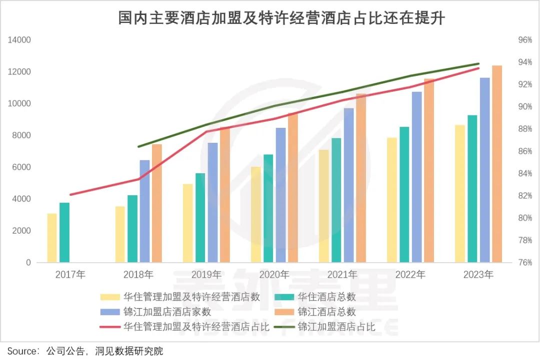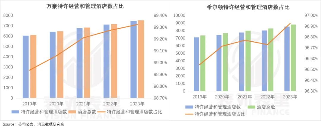 可以看到,国际知名的希尔顿、万豪等,加盟与特许经营酒店占比已经达到90%以上,且还在继续升高。