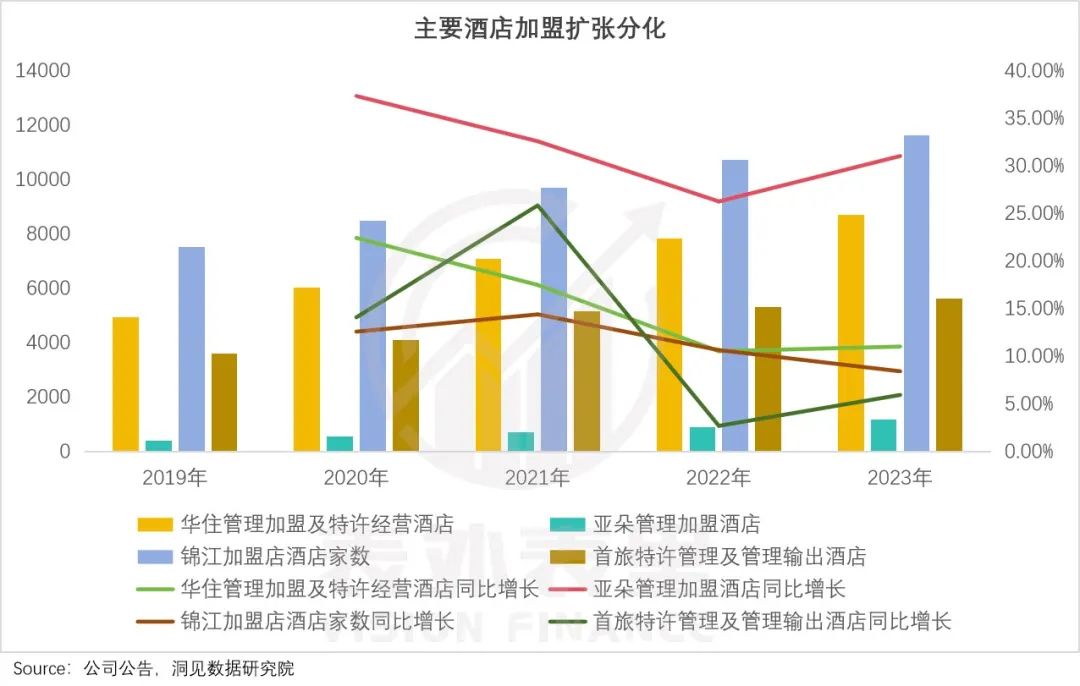 可以看到,2023年,亚朵、华住的加盟增长保持10%以上;首旅、锦江的该数据,都是个位数。