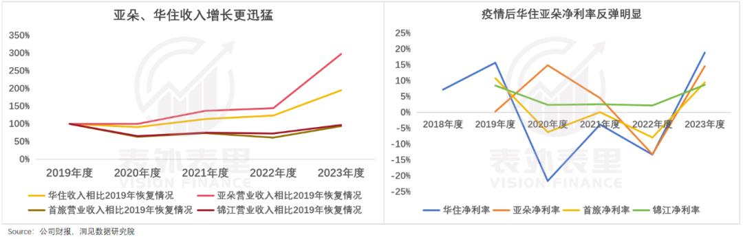 国内几家巨头的表现,也验证了这一点。可以看到,同样是趁势抄底、大搞加盟,2022-2023年疫后恢复期里,无论是收入还是净利润反弹的表现,华住、亚朵都远高于锦江、首旅。