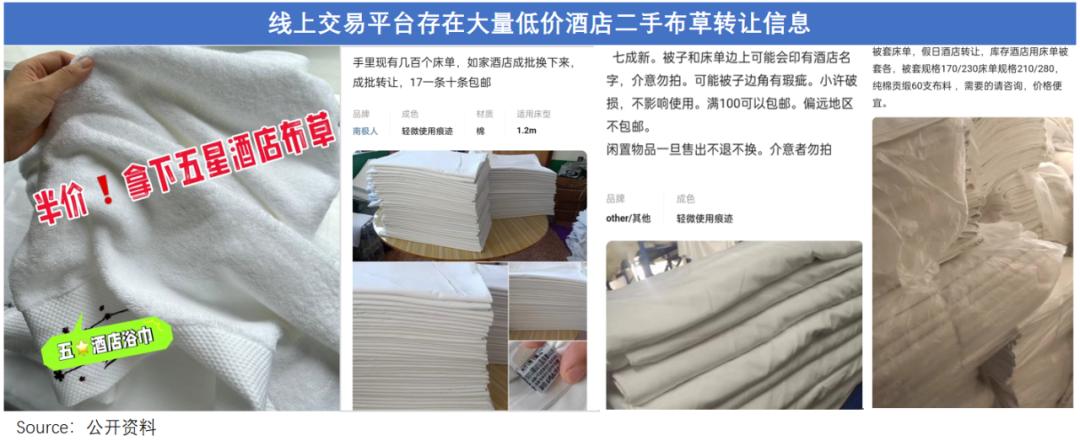 以二手布草为例,没扛过疫情的酒店老板们为了尽快回血,已经把全新的单人米缎条床单砍到9块9一床,“半价、地板价拿五星级酒店品质布草”等信息,更是不胜枚举。