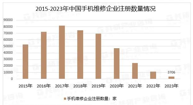 或许是统计方式的差异,小雷搜索出的2023年中国手机维修企业注册数比上图的3706家还要低。企查查最新数据显示,2023年经营范围包含“手机维修”的企业注册数仅为1144家,相较2017年的注册高峰下滑近99%。