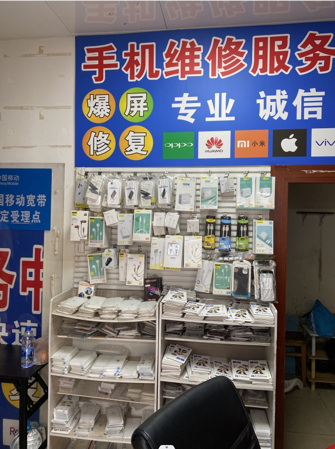 第一站是坐落在某城中村的手机快修中心,说是中心,其实就是一个十几平方的小门面,与两边的菜鸟驿站和照相馆形成一个和谐整体,招牌罗列着可承接业务。
