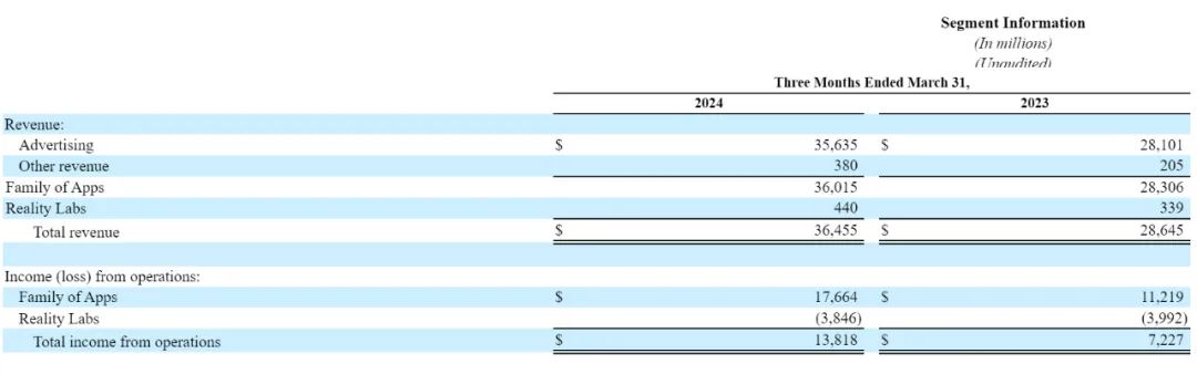 Meta在2024年第一季度的来自Apps家族的收入为360.15亿美元,上年同期为283亿美元;