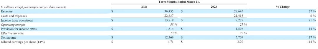 Meta在2024年第一季度的运营利润为138.18亿美元,较上年同期的72.27亿美元增长91%;运营利润率为38%,上年同期为25%。