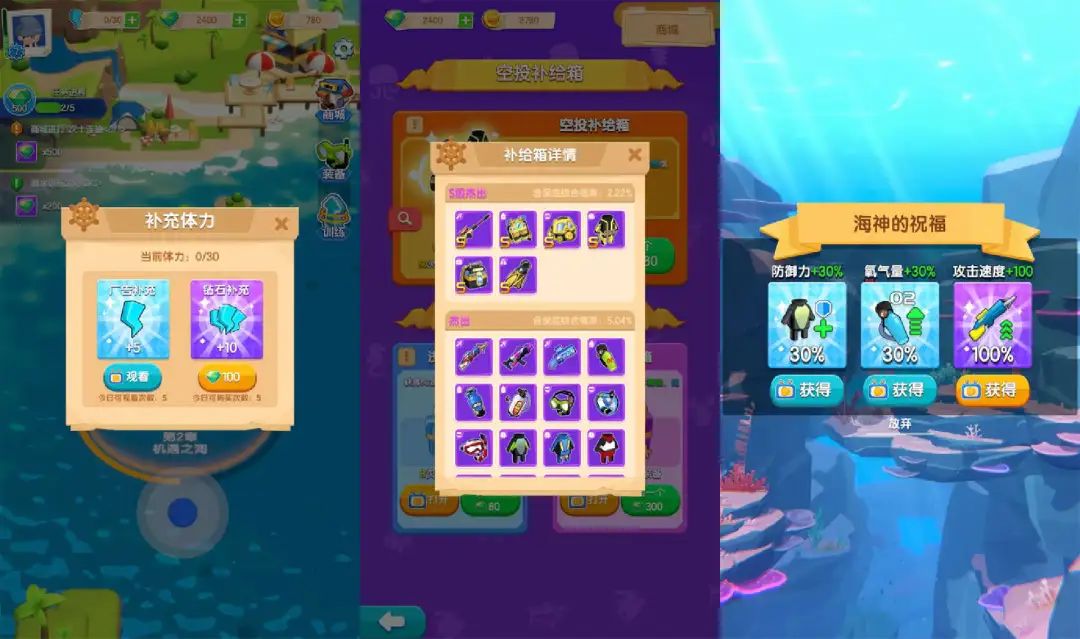 总体看来,《潜水日记》比较像简化版并加入了一点创新的「潜水员戴夫」。游戏采用混合变现模式。像体力值、商店补给箱(有概率刷出稀有装备)都可以通过充值绿钻去购买,也可以观看广告进行解锁。在下潜前观看广告还可得到翻倍奖励,例如增加防御力、攻击力或暴击伤害。此外,游戏还设置了长线任务如「七日潜水挑战」,完成相应指标也可获得绿钻(或许之后还可参考《潜水员戴夫》加入一些限时活动和短期任务)。