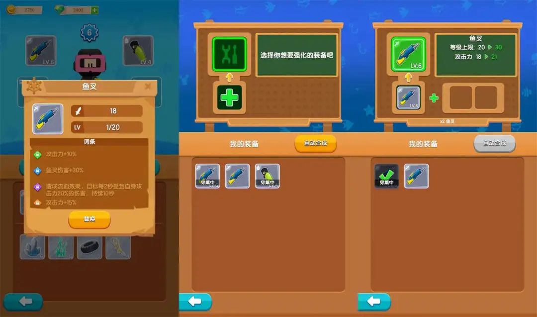 而潜水玩法中的「捕鱼」与我们所熟知的捕鱼游戏不太一样,它更像一种对战模式。首先,游戏为玩家提供了各种捕鱼装备。例如「水下武器」——鱼叉、冲锋枪、狙击枪等,它们有着不同的属性和攻击方式,另外还有氧气瓶、潜水镜、潜水服、潜水鞋等,以上装备都可以随着角色等级提升进行升级或强化合成。