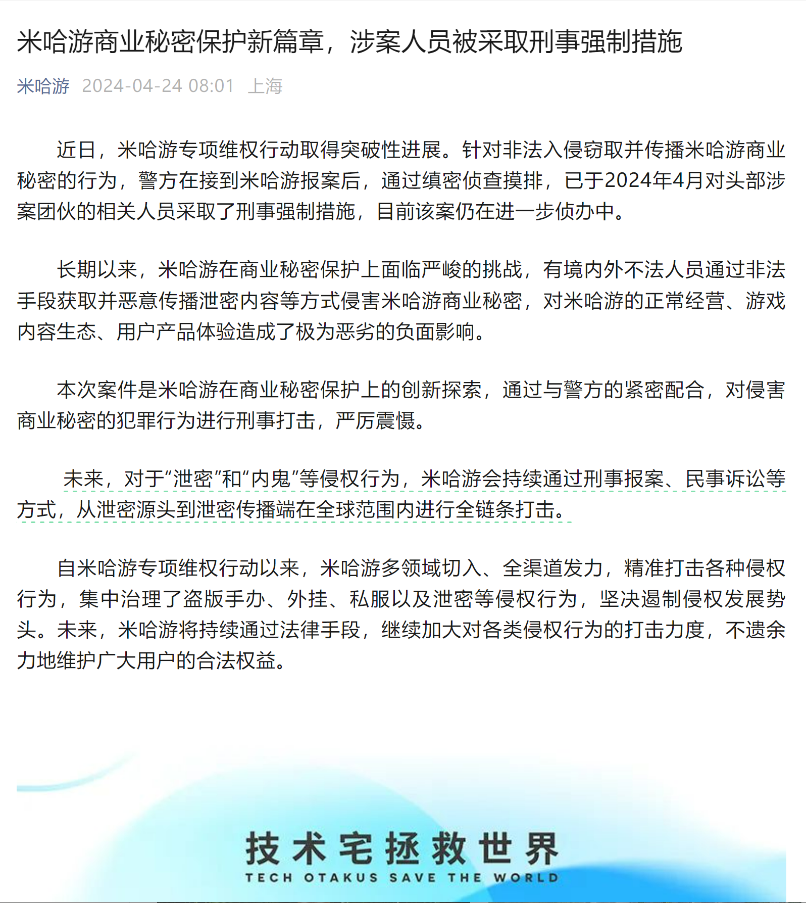 总有境内外不法人员通过非法手段,获取并恶意传播泄密内容,侵害米哈游商业秘密。