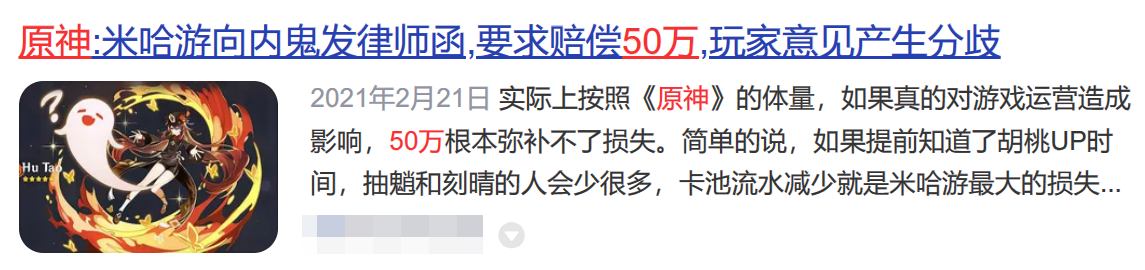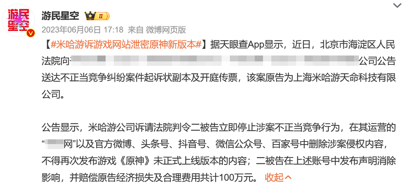 2023年6月,米哈游以泄密原神新版本为由起诉某游戏网站,最终法院判处后者需要赔偿米哈游100万元。