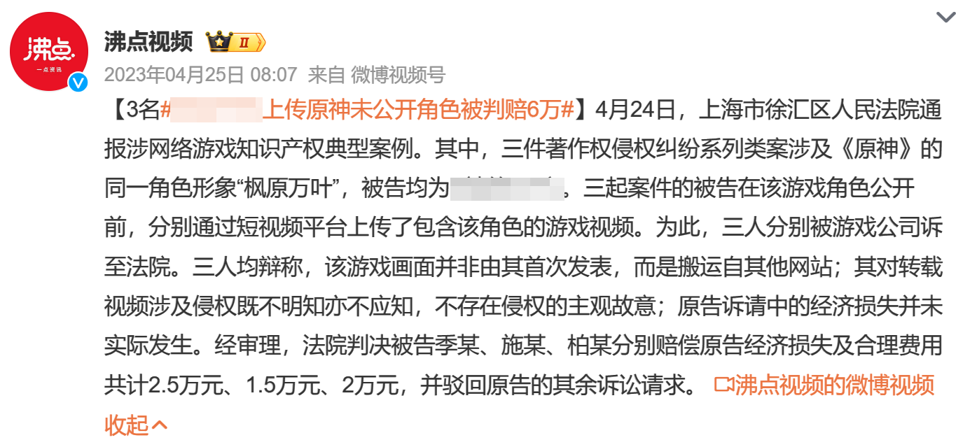 2023年4月,3名博主将《原神》还没公开的角色视频,上传到了某视频平台。于是这几人就被米哈游告了,3人合计需要赔偿米哈游共6万元。
