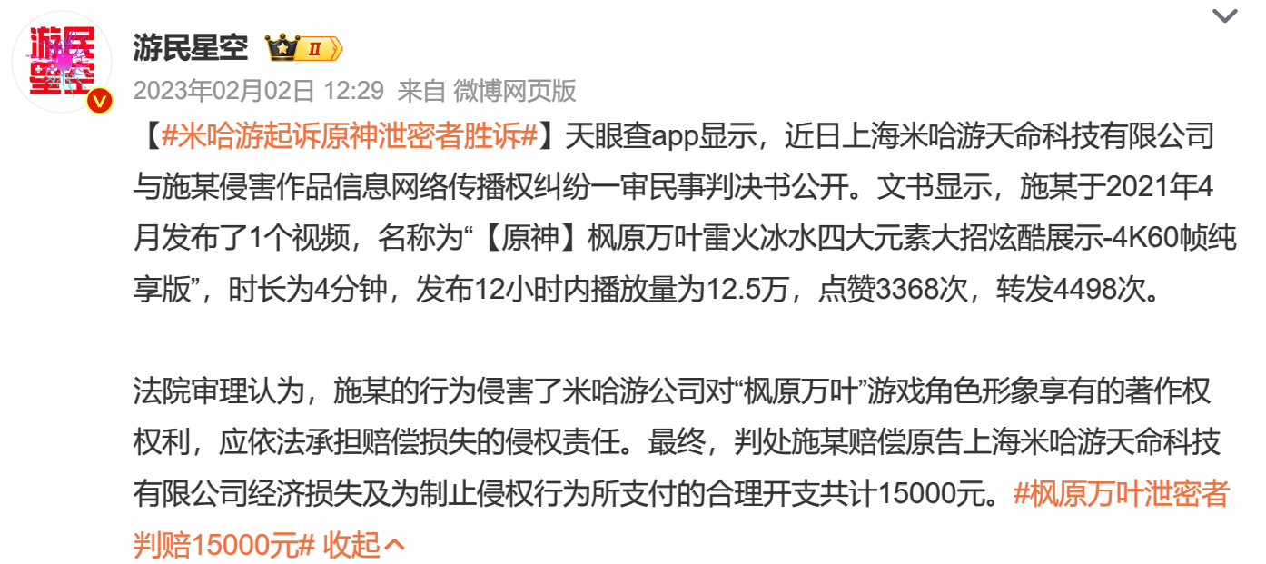 2023年1月,施某因为提前公开角色被米哈游起诉,前者被判侵害后者对游戏角色形象享有的著作权利,最终施某需要赔偿米哈游15000元。