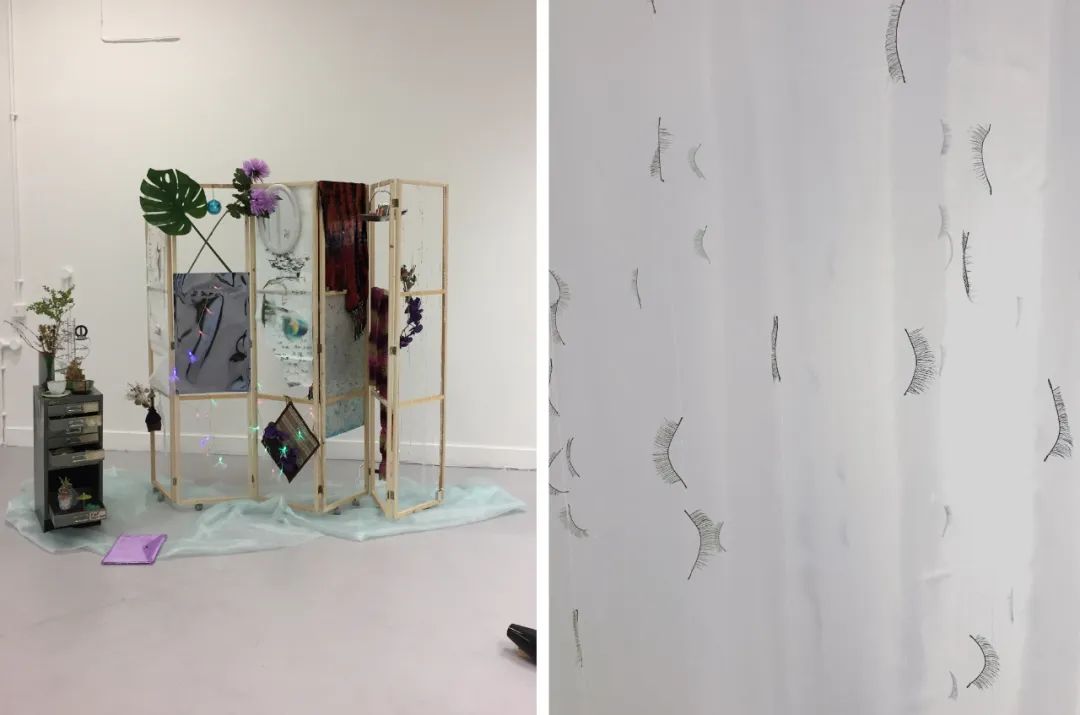 左:王梓暄设计制作的屏风,右:作品《风的见闻》,风吹过时,眼睫毛做的帘子会“眨眼”