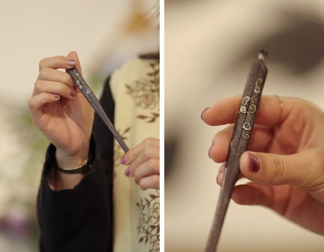 我收藏了武士刀上的一个小配件,它可以作为筷子,也可以用来近身防御。在古代,它是一个跟作战有关的物品。在现代,我们可以拿它来当焚香的香筷或者是作为发簪,把几百年前的腥风血雨变成现在的风花雪月。