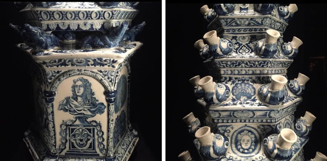 在英国的博物馆发现了中国的青花瓷,形制是欧洲宫廷典型的郁金香塔形花器,纹样也是欧洲人和欧洲植物