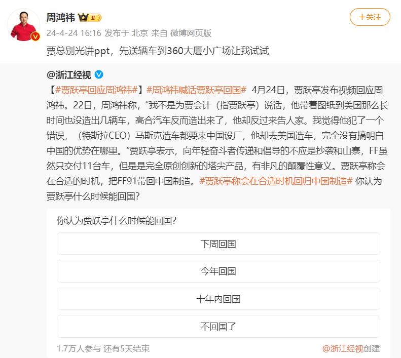 4月24日,贾跃亭对此回应称,“为盗窃者鼓噪不应该是老周(周鸿祎)的价值观。”周鸿祎在微博发文回应称,“贾总别光讲ppt,先送辆车到360大厦小广场让我试试。”随后,周鸿祎又发视频回应问:“老贾你啥时候回国?”4月25日下午,贾跃亭再次发视频回应周鸿祎,称FF的供应链正在努力向中国转移,我们也会在合适的时机把FF91带回到中国制造。(每日经济新闻)