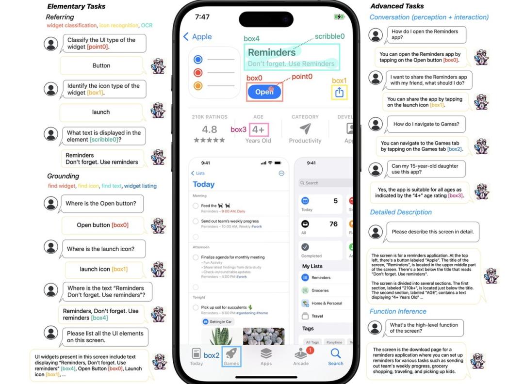 其中,Ferret-UI 被描述为一种新的 MLLM,专为理解移动 UI 屏幕而定制,具有「指向、定位和推理功能」。它最大的特点是有一个放大系统,可以将图像放大到「任何分辨率」,使图标和文本更易于阅读。