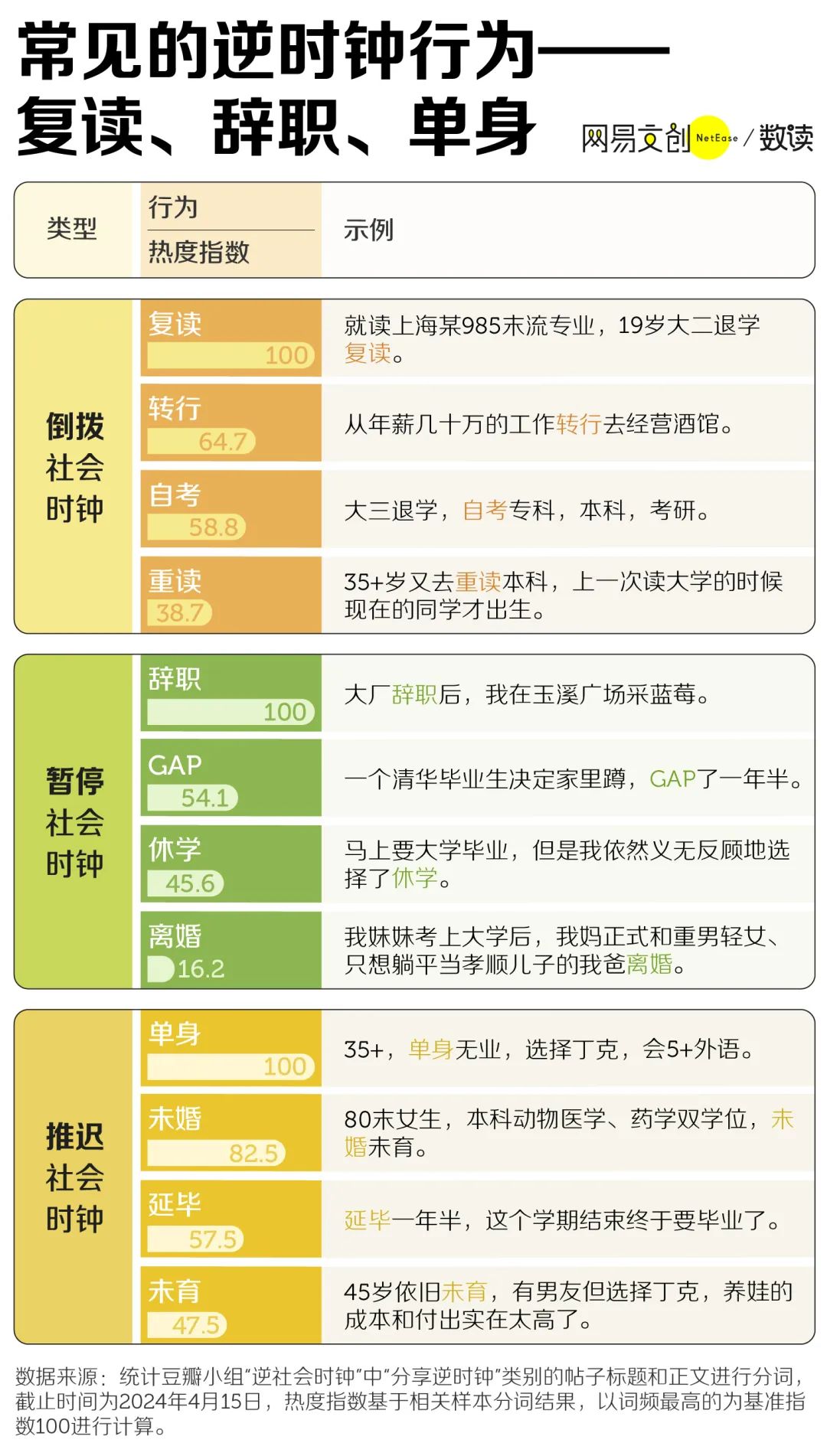 要逆社会时钟,走的自然不是单行道。一篇发表在《中国青年研究》上的论文,就将逆社会时钟的行为划分为了倒拨、暂停、推迟三类 [6]。