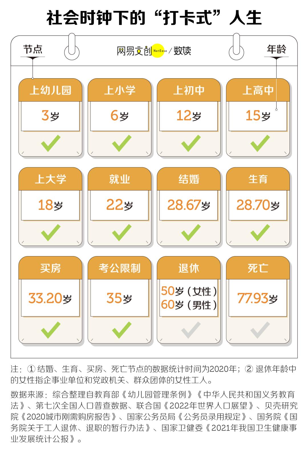 等到 22 岁毕业,成为打工仔,在 28 岁和“凑活过”的相亲对象步入婚姻的殿堂,水到渠成地生娃,在 33 岁买房的同时背上二三十年的房贷,直到 60 岁退休,最后在 77 岁“完美收棺”。