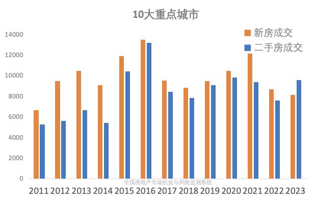 活跃程度不同,导致交易结构出现变化。据易居研究院统计数据,北、上、广、深、杭、苏、宁、成等10大重点城市,2023年二手房成交量首次超过新房。