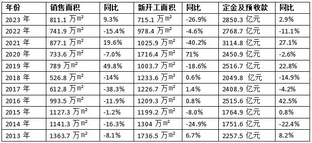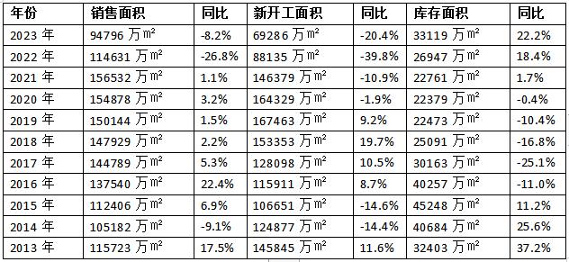 扩大到全国范围内,新房市场的成交量仍然处于低位。国家统计局数据显示,2023年全国新建商品住宅的成交面积降低到10亿平方米以下,为2010年以来最低。