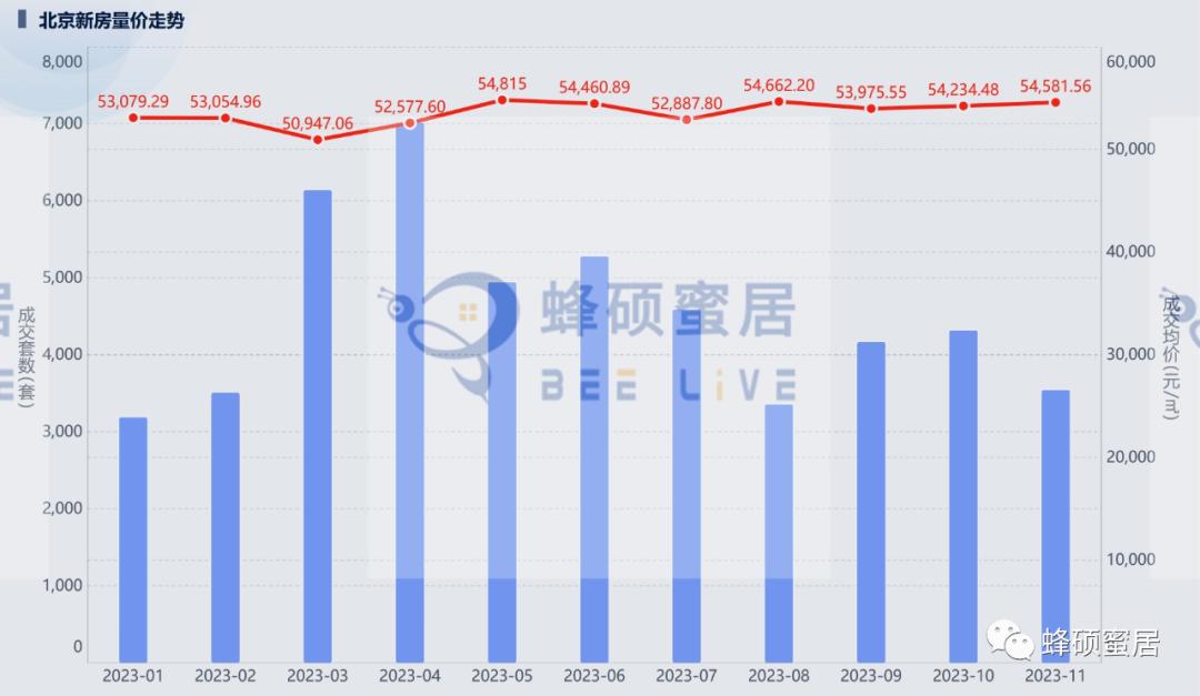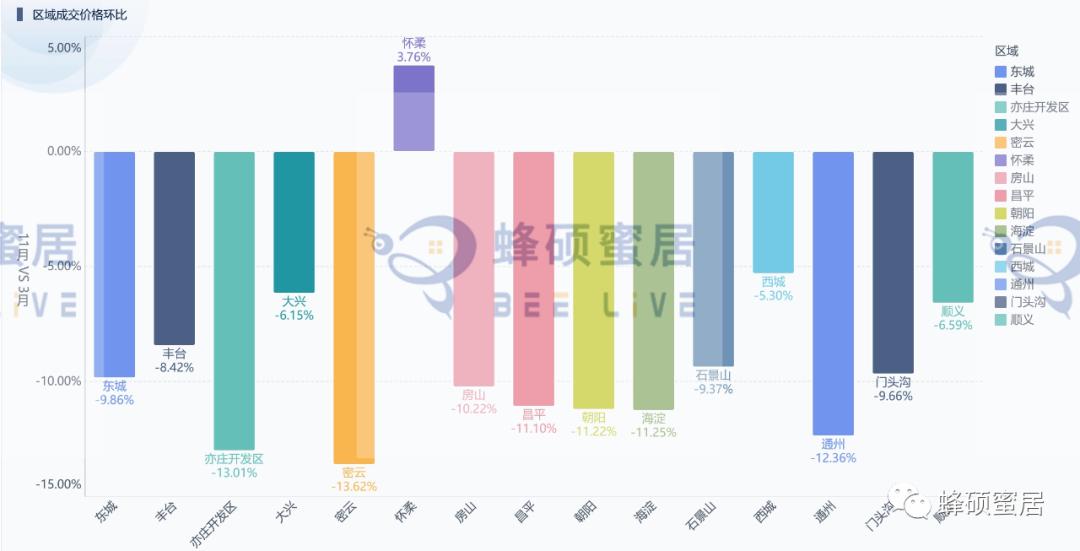 蜂硕研究院对北京市场的监测数据对比更为明显:北京二手房市场几乎在全线降价,但新房市场量跌价稳。